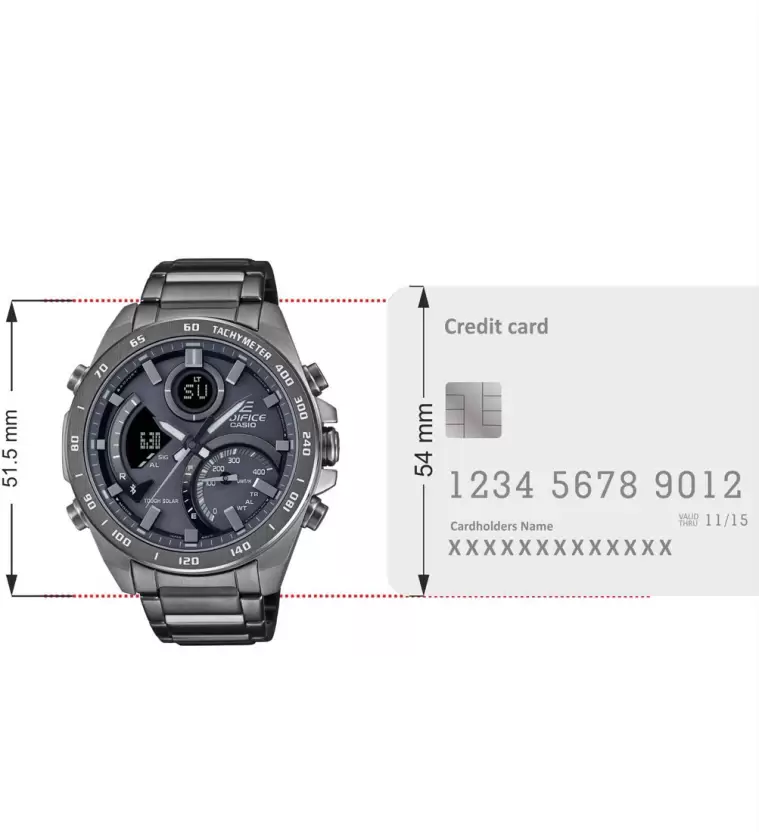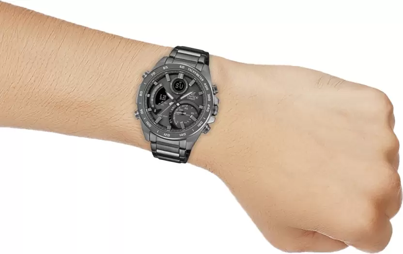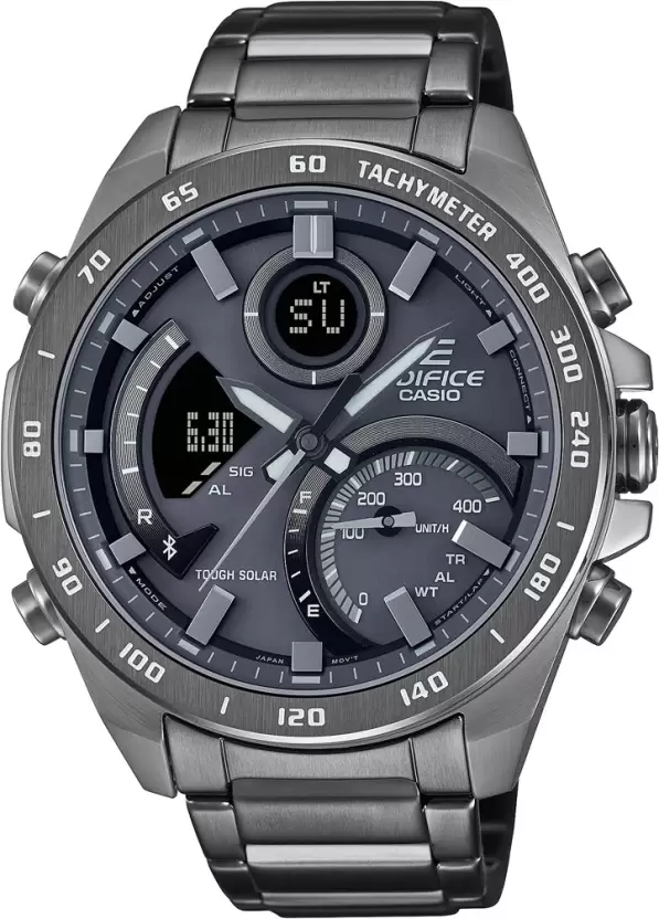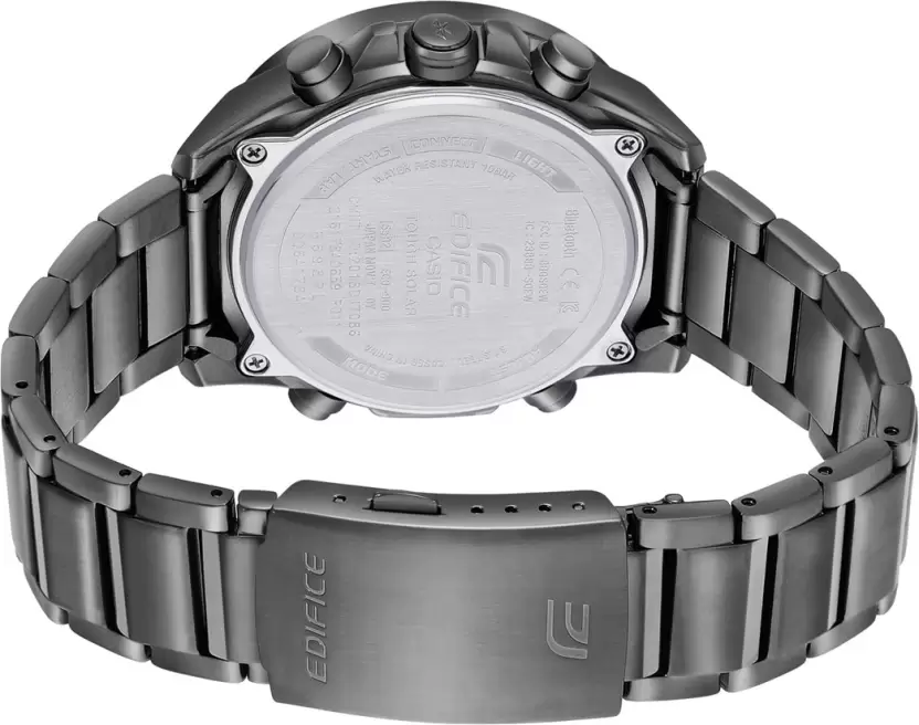 Say hello to the digital-analog EDIFICE with full-on smartphone functionality. Introducing the international bestseller with gray ion-plated case and band for a monochromatic treatment that keeps the focus on speed, intelligence, and powerful design. Sync with your smartphone via Bluetooth for to-the-second precision timekeeping, wherever you go. Simply tap on the app to effortlessly manage functions like the World Time list of over 300 cities. The large inset dial at the 4 o’clock position displays average speeds when timing laps for set distances. Fully automatic LED light illuminates the dial and LCD display with just a tilt of the wrist, ensuring high visibility even in the dark.