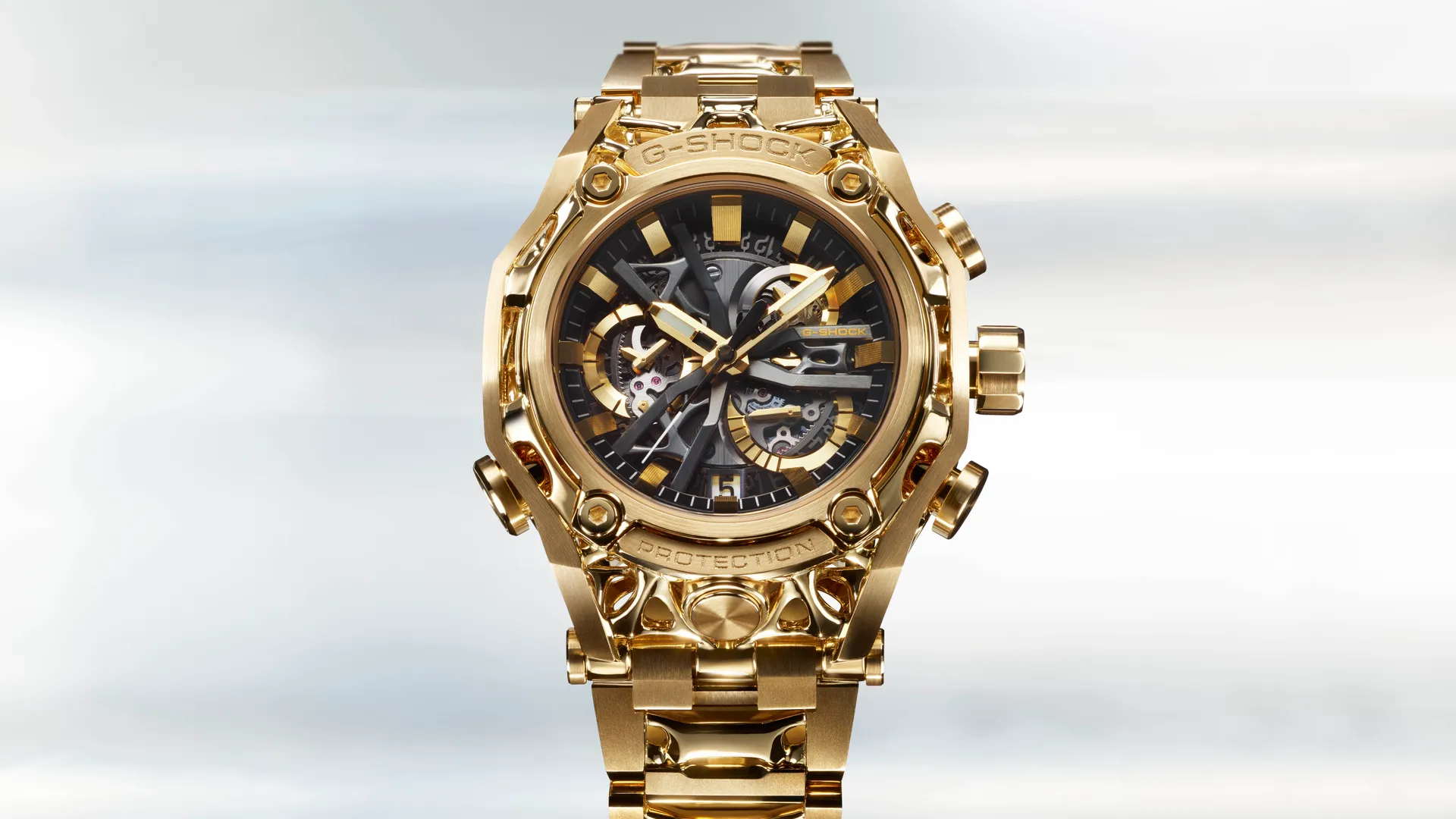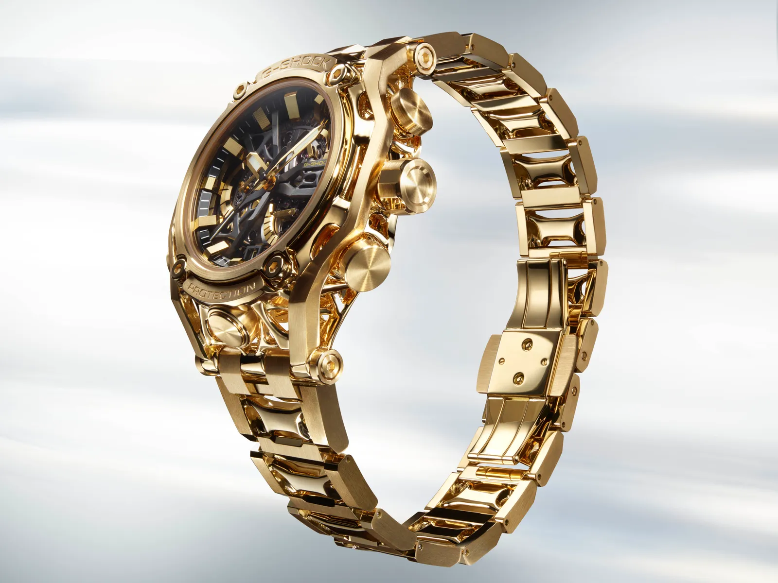 ORIGINAL COLOURS IN A UNIQUE STRENGTH METAL TWISTED TOUGHNESS AND SOPHISTICATION IN A NEW FORM. Introducing a special model to commemorate 20 years of the MT-G, the Metal Twisted G-SHOCK. In addition to a rainbow IP on the bezel meant to evoke a lunar rainbow, this model also features a blue IP on the lug and the band pieces, as well as a gold colouration on the crown, front screws, and other components.This radio-controlled, solar-powered model merges the tough feel of metal with original colours, and also includes shock resistance and Bluetooth® functionality.