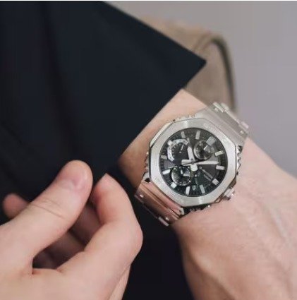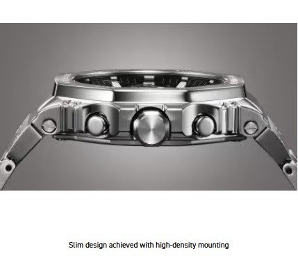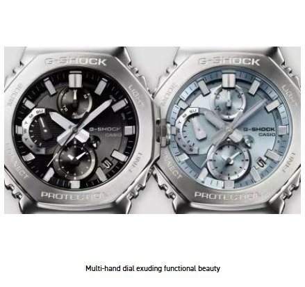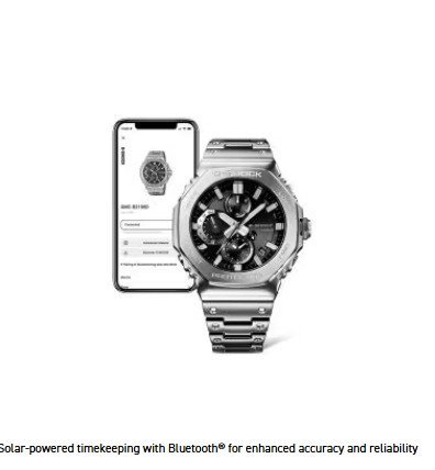 Introducing the full-metal chronograph addition to the continually evolving 2100 line of timepieces which inherit the legacy of the first-ever G-SHOCK, the DW-5000C. We take it way back with the octagonal bezel and dimpled band design of the original from 1983, but all done in metal with stainless-steel case, bezel, and band. Buffering components made of fine resin are installed between the bezel and the case for a shock-resistant structure with a full-metal exterior. The bezel — formed three-dimensionally in a time-consuming forging, cutting, and polishing process — is finished beautifully with a circular hairline treatment on the top surface and mirror polish on the slopes. The delicate molding and vapor deposition of Casio ultra-precision processing technologies add sophistication and quality to the indexes and inset dial rings. The screw-lock crown is designed in the same octagonal shape as the bezel for a more compact case with no sacrifice in outstanding G-SHOCK shock resistance. High-density mounting keeps the module slim, while still providing the advanced functions you love in a compact profile and comfortable fit. Pairs with a smartphone via Bluetooth®. Simply tap into the dedicated app for precision timekeeping that keeps you on track. With Tough Solar, a high-brightness LED light, and a range of other convenient functions, this is a timepiece that delivers both superior style and practical utility.